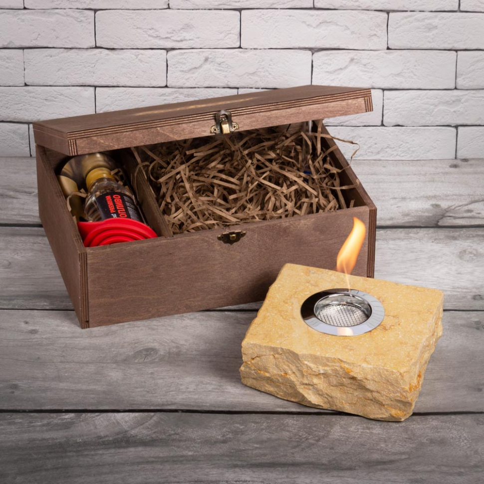 Мини-камин работает на биотопливе. Одной заправки топливного блока хватает на 2-4 часа непрерывного горения.